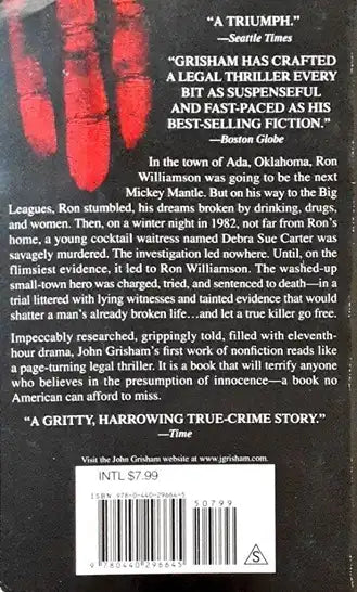 In the town of Ada, Oklahoma, Ron Williamson was going to be the next Mickey Mantle. But on his way to the Big Leagues, Ron stumbled, his dreams broken by drinking, drugs, and women. Then, on a winter night in 1982, not far from Ron’s home, a young cocktail waitress named Debra Sue Carter was savagely murdered. The investigation led nowhere. Until, on the flimsiest evidence, it led to Ron Williamson. The washed-up small-town hero was charged, tried, and sentenced to death—in a trial littered with lying witnesses and tainted evidence that would shatter a man’s already broken life…and let a true killer go free. Impeccably researched, grippingly told, filled with eleventh-hour drama, John Grisham’s first work of nonfiction reads like a page-turning legal thriller. It is a book that will terrify anyone who believes in the presumption of innocence—a book no American can afford to miss.