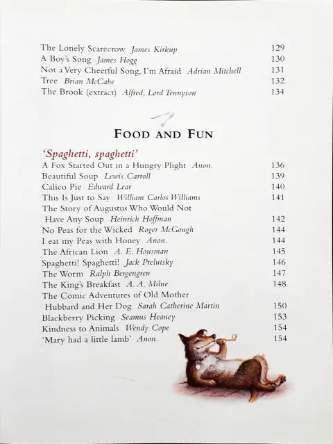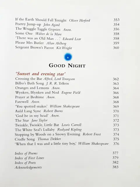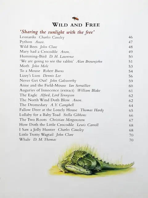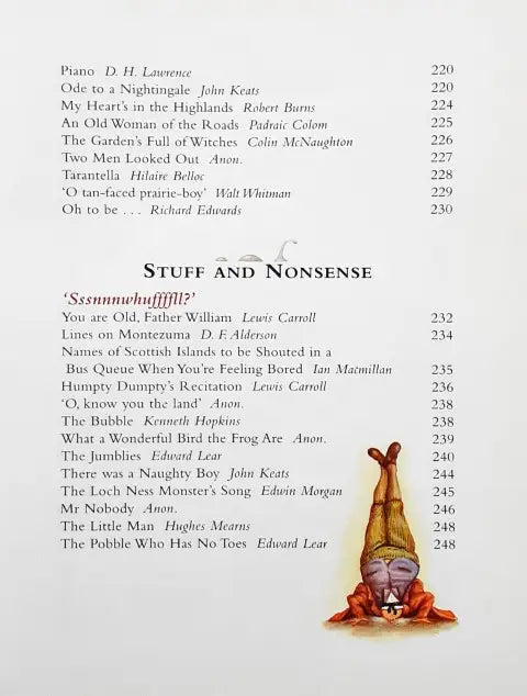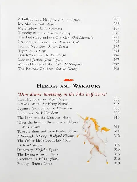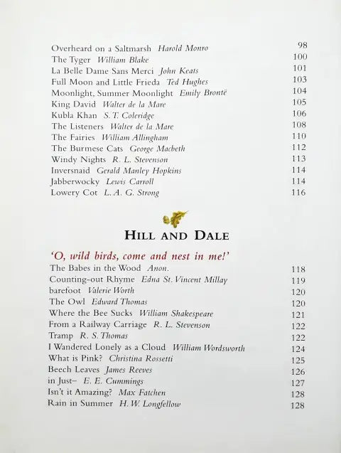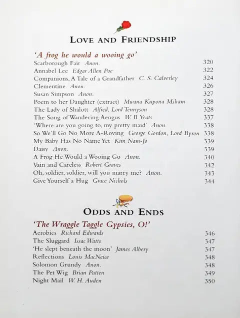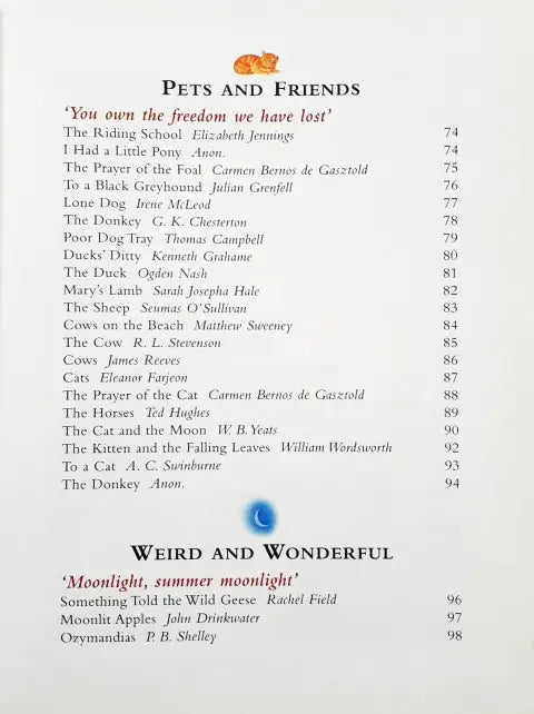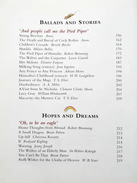 This book is divided into 15 sections - Beginnings, Wild And Free, Pets And Friends, Weird And Wonderful, Hill And Dale, Food And Fun, Ballads And Stories, Hopes And Dreams, Stuff And Nonsense, River And Sea, Young And Old, Heroes And Warriors, Love And Friendship, Odds And Ends, Good Night. Each section in the treasury contains around 20 poems.