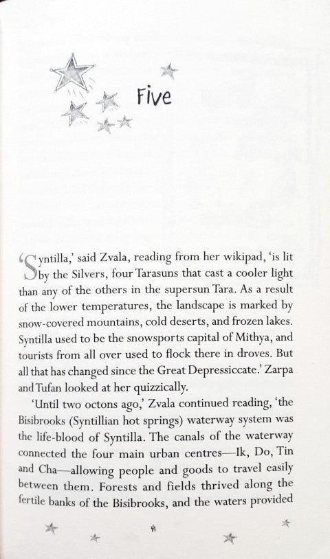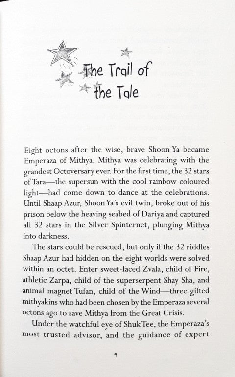 One half of Mithya shining another half still in the dark – glide away with the Taranauts on another thrilling ‘chilling’ adventure! Mithya’s eight worlds – Shyn Lustr Sparkl Glo Dazl Shimr Syntilla and Glytr – were plunged into darkness when the wicked Shaap Azur captured all its 32 stars. There was no hope until Zarpa Tufan and Zvala – three bright and brave Taranauts with special gifts - set out to bring back light and cheer to Mithya. At the end of four missions the score reads 4-0 in favour of the Taranauts. Nervous and desperate Shaap Azur’s Ograzurs are in attack mode taking the war to the enemy at impregnable Kay Laas! The attempt fails and the Taranauts zip away to the icy world of Syntilla but Eye-in-the-Sky has other tricks up his sleeve. Will the giant Syntillakos still grieving over the sudden drying up of their life-giving Bisibrooks Waterway rise up to help the Taranauts?