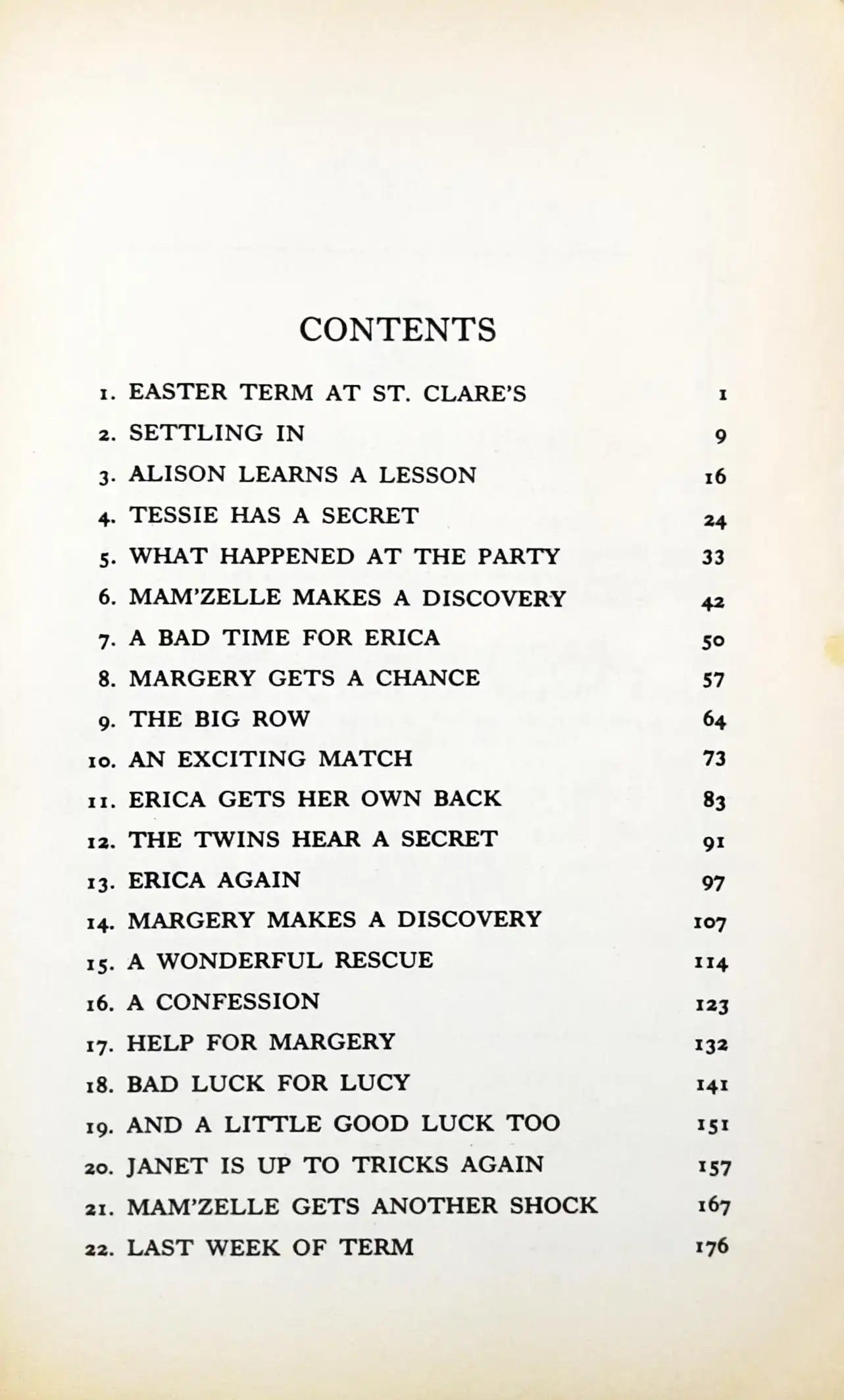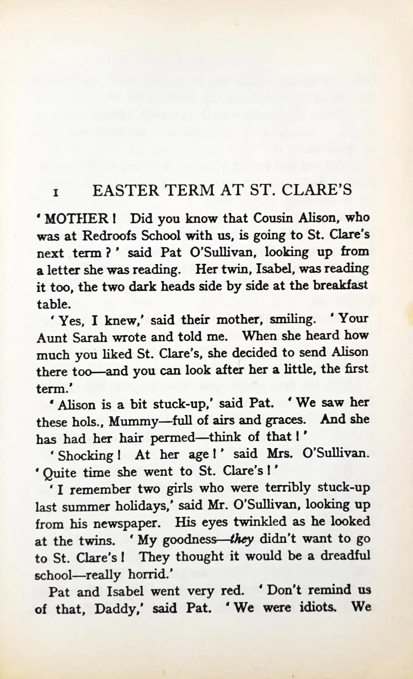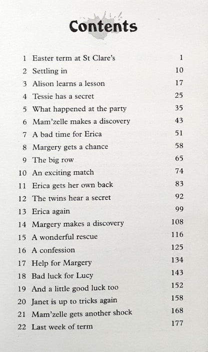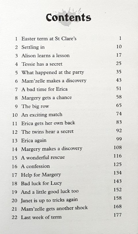 It's the start of the Easter Term and Pat and Isabel are looking forward to meeting all their friends at St Clare's once more. The new girls prove to be a source of much amusement, and there is all the fun of boarding-school life as well.
