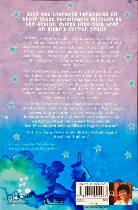 About the Book: Taranauts 7: The Search for the Glytr Turquoise Join the intrepid Taranauts on their most formidable mission asthe action shifts into high gear on Glytrs Terror Trail! Mithy aseight worlds Shyn, Lustr, Sparkl, Glo, Dazl, Shimr, Syntilla andGlytr-were plunged into darkness when the wicked Shaap Azurcaptured all its 32 stars. There was no hope until Zarpa, Tufan andZvala-three bright and brave Taranauts with special gifts-set outto bring back light and cheer to Mithya. Six times they have beenstretched to the limit, and six times-undaunted by mind-bogglingriddles, monsters and mayhem-the Taranauts have returnedsuccessful. Now they are headed for the razzle-dazzle ofGlytrscapital city, Boom Bolly Bay, where, unknown to them, ShaapAzurhas changed the rules of the terror game. Can the Taranautssave a hazillion unsuspecting Glytrkos from bubbling, burblingdeath? Will Zarpa succeed in preventing a terrible tragedy at theBel Nolo Inter-World Cup Final? And where in the world has Shaapimprisoned Max Moolah, the 15-octon-old heir to BBBays biggestfortune? Will the Turquoises shine down on Glytr again? Read andfind out!
