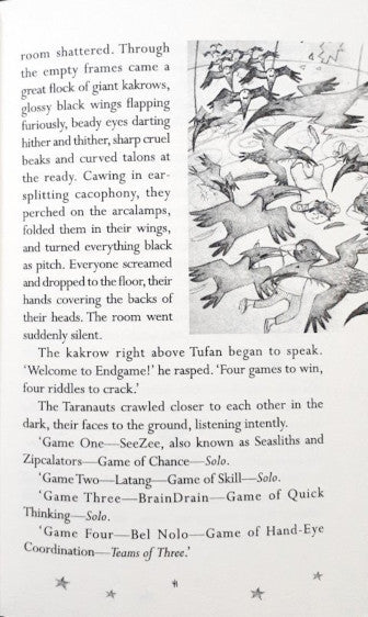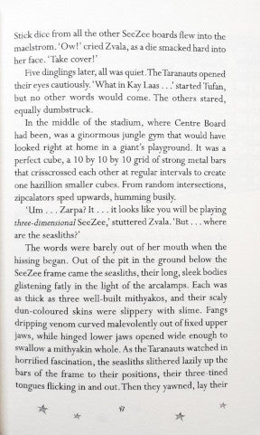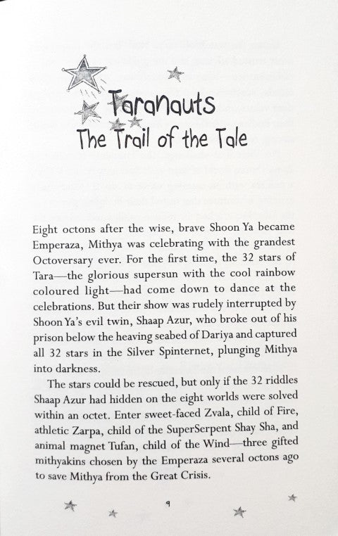 Mithya's eight worlds - Shyn Lustr Sparkl Glo Dazl Shimr Syntilla and Glytr - were plunged into darkness when the wicked Shaap Azur captured all the 32 stars of Tara. All seemed lost until Taranauts Zarpa Tufan and Zvala - three bright brave and gifted mithyakins - set out on the difficult and dangerous quest to bring back light and cheer to Mithya. This time the Taranauts travel to Zarpa's home world of Sparkl to rescue the four Amethysts only to discover that Shaap Azur has upped the stakes like never before. They have to win four deadly games against wily opponents seen and unseen! What's more Shaap Azur's henchman Ograzur Dusht has launched a secret search for a spy in Shoon Ya's camp!