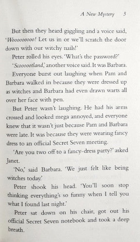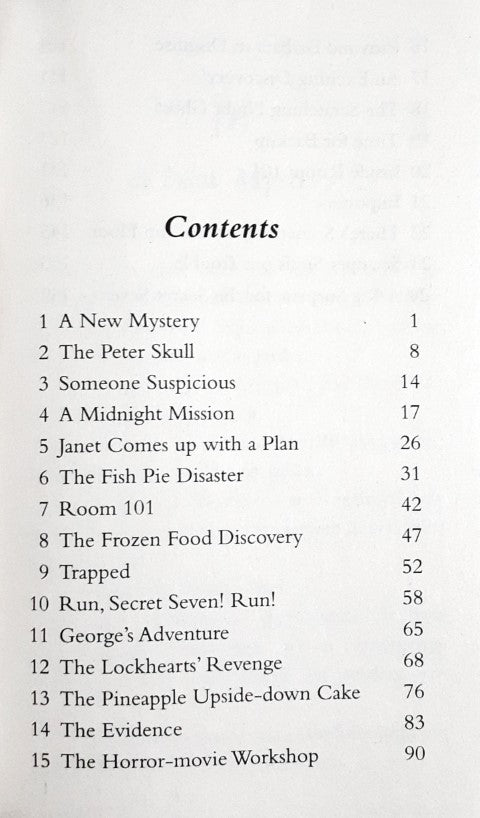 When Peter finds an old skull hidden in his bedroom, he calls an urgent meeting of the Secret Seven. The detective friends soon discover a gigantic hole in the ground at the local hotel and some new arrivals behaving very strangely. Nothing can stop the Seven from investigating now, not even a disgusting dinner or a bike ride in their pyjamas.