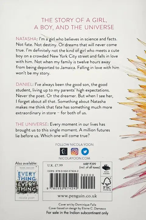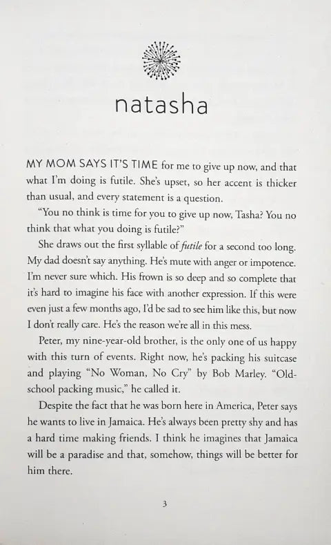 Natasha was a firm believer in science and hard facts. She scoffed at the mere mention of fate, destiny, or dreams too distant to grasp. The idea of her falling head over heels for a charming boy on the bustling streets of New York City was the stuff of fairy tales – something reserved for starry-eyed dreamers, not her. Especially not when her family teetered on the precipice of deportation to Jamaica. Love, she was convinced, had no place in her story.
