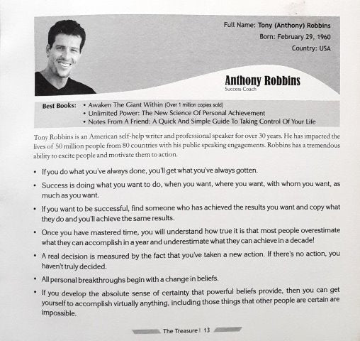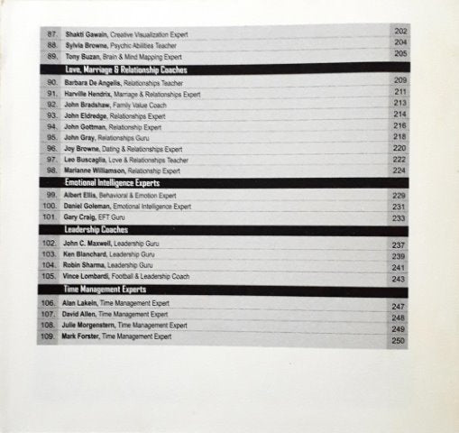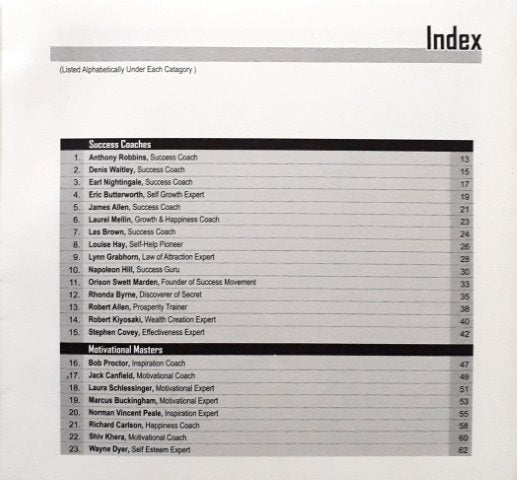 Unique and infinite treasure of wisdom - full of precious thoughts. Presenting to you the essence from the world's 109 greatest motivational and self-help gurus who have helped millions to improve their lives by their books, seminars and coaching.