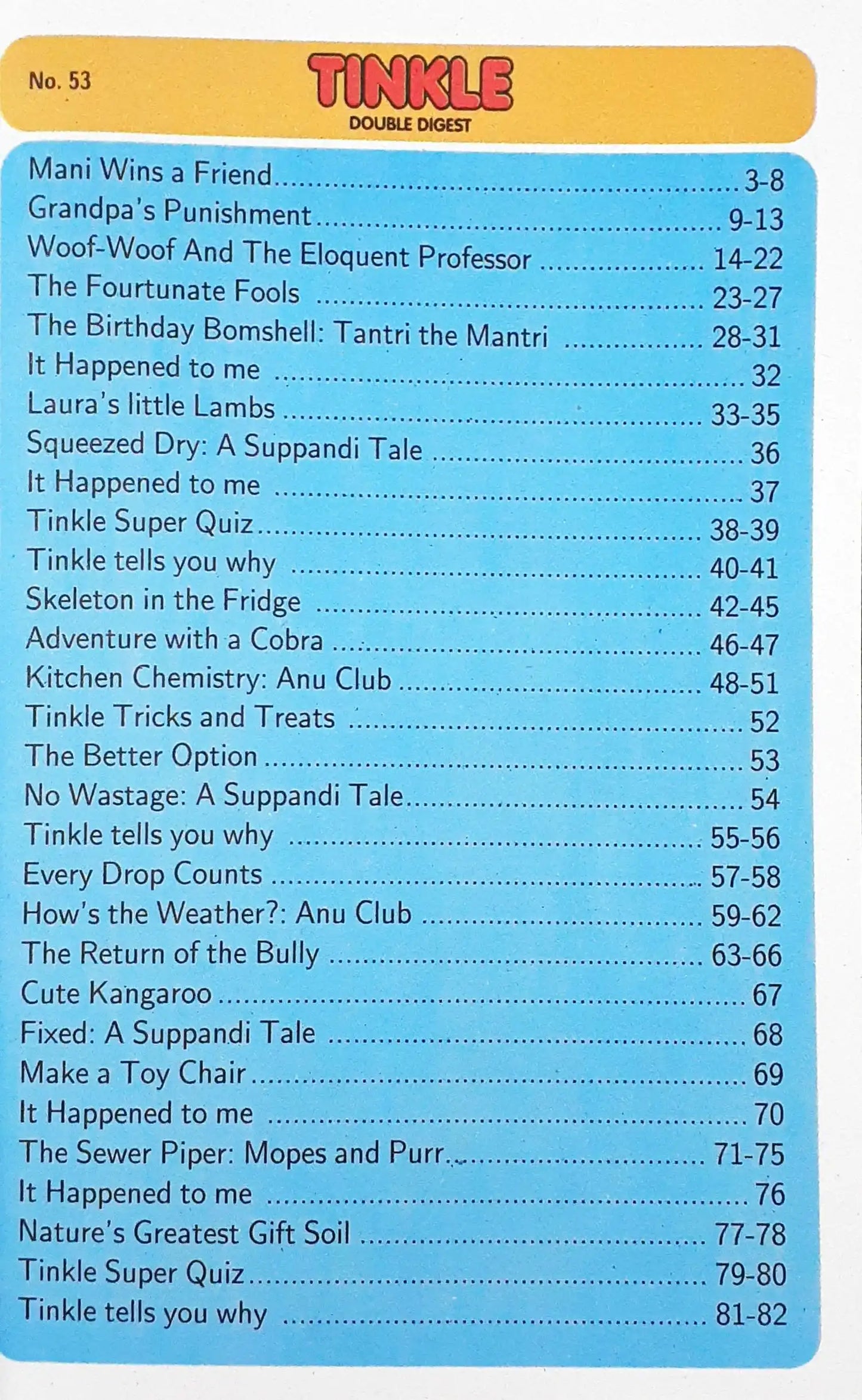 With a diverse array of comics, from action-packed superhero tales to heartwarming friendship stories, Tinkle Double Digest has something for everyone. Dive into the magical world of Anwar, the Genie, as he grants wishes with a twist, and embark on thrilling quests with Kalia the Crow and Chamataka the Fox.