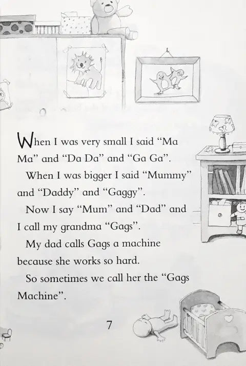 The arrival of a new baby ushers in a bustling household for the entire family. Fortunately, Gags, the narrator's beloved grandmother, is a constant presence, transforming into the "Gags machine" when the house requires a thorough cleaning and a delicious dinner must be prepared. Gags is not just about chores; she knows how to have fun, whether it's playing dress-up or heading to the park for a day of adventure. Even when the family gears up for a beach vacation with an abundance of packing to be done, Gags is there to lend a helping hand. However, in the midst of it all, everyone comes to realize that even the most reliable "Gags machines" need a well-deserved rest.