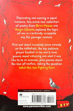 New poems about war. Fascinating and moving in equal measure, this brand new collection of poetry explores the topic of war in a brilliantly accessible way for younger readers. Find out about incredibly brave animals on the battlefield, the day soldiers played football in no man's land, poems about rationing and what it was like to be an evacuee, plus poems about the idea of warfare, asking the question What Are We Fighting For?