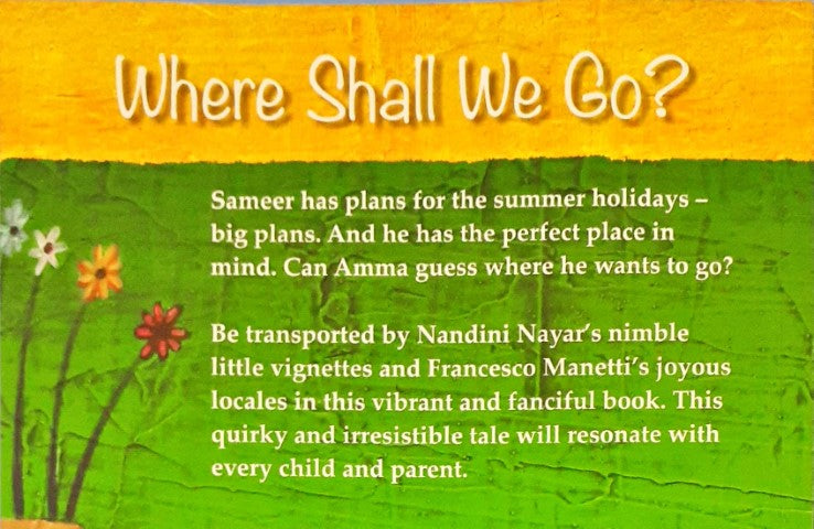 Sameer has plans for the summer holidays – big plans. And he has the perfect place in mind. Can Amma guess where he wants to go? Be transported by Nandini Nayar's nimble little vignettes and Francesco Manetti's joyous locales in this vibrant and fanciful book. This quirky and irresistible tale will resonate with every child and parent.
