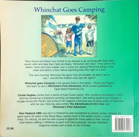 Twins Suzie and Rupert are thrilled to be allwoed to go camping with their older cousin John and take their Optimist dinghy Whinchat with them. They sail to the beach, swim and cook supper over a camp fire, leaving Whinchat afloat in the creek and tied to a tree before spending their first night in a tent. The next morning, Whinchat has gone. Has she floated all alone, out to sea and will the children ever see her again?