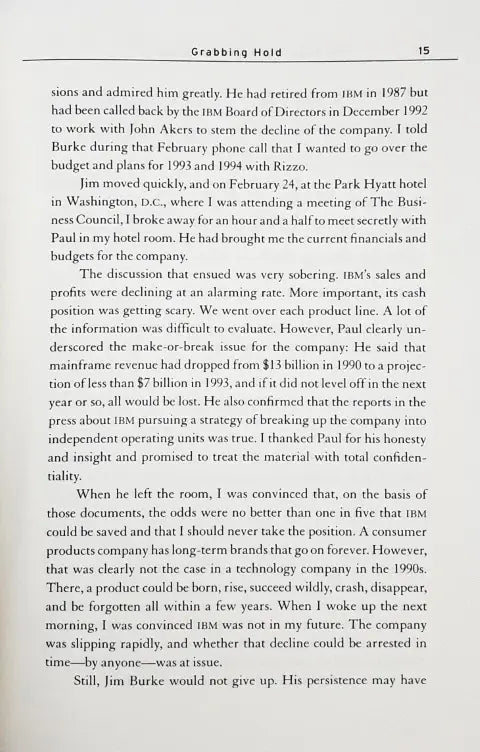 In 1990, IBM had its most profitable year ever. By 1993, the computer industry had changed so rapidly the company was on its way to losing $16 billion and IBM was on a watch list for extinction -- victimized by its own lumbering size, an insular corporate culture, and the PC era IBM had itself helped invent. Then Lou Gerstner was brought in to run IBM. Almost everyone watching the rapid demise of this American icon presumed Gerstner had joined IBM to preside over its continued dissolution into a confederation of autonomous business units. This strategy, well underway when he arrived, would have effectively eliminated the corporation that had invented many of the industry's most important technologies. Instead, Gerstner took hold of the company and demanded the managers work together to re-establish IBM's mission as a customer-focused provider of computing solutions. Moving ahead of his critics, Gerstner made the hold decision to keep the company together, slash prices on his core product to keep the company competitive, and almost defiantly announced, "The last thing IBM needs right now is a vision." Who Says Elephants Can't Dance? tells the story of IBM's competitive and cultural transformation. In his own words, Gerstner offers a blow-by-blow account of his arrival at the company and his campaign to rebuild the leadership team and give the workforce a renewed sense of purpose. In the process, Gerstner defined a strategy for the computing giant and remade the ossified culture bred by the company's own success. The first-hand story of an extraordinary turnaround, a unique case study in managing a crisis, and a thoughtful reflection on the computer industry and the principles of leadership, Who Says Elephants Can't Dance? sums up Lou Gerstner's historic business achievement. Taking readers deep into the world of IBM's CEO, Gerstner recounts the high-level meetings and explains the pressure-filled, no-turning-back decisions that had to be made. He also offers his hard-won conclusions about the essence of what makes a great company run. In the history of modern business, many companies have gone from being industry leaders to the verge of extinction. Through the heroic efforts of a new management team, some of those companies have even succeeded in resuscitating themselves and living on in the shadow of their former stature. But only one company has been at the pinnacle of an industry, fallen to near collapse, and then, beyond anyone's expectations, returned to set the agenda. That company is IBM. Lou Gerstener, Jr., served as chairman and chief executive officer of IBM from April 1993 to March 2002, when he retired as CEO. He remained chairman of the board through the end of 2002. Before joining IBM, Mr. Gerstner served for four years as chairman and CEO of RJR Nabisco, Inc. This was preceded by an eleven-year career at the American Express Company, where he was president of the parent company and chairman and CEO of its largest subsidiary. Prior to that, Mr. Gerstner was a director of the management consulting firm of McKinsey & Co., Inc. He received a bachelor's degree in engineering from Dartmouth College and an MBA from Harvard Business School.