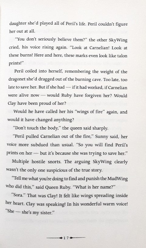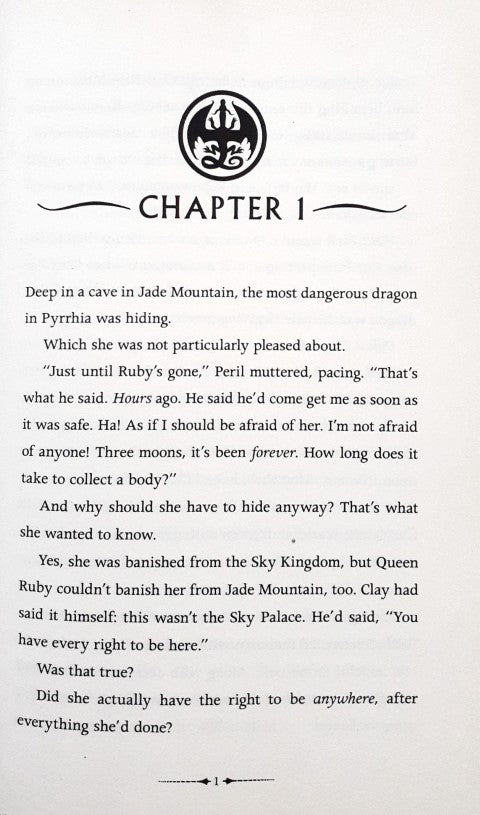 Peril, once fiercely loyal to Queen Scarlet, whose deadly firescales claimed the lives of countless dragons in the SkyWing arena, now stands by Clay, the sole dragonet who has shown her true friendship. When Scarlet poses a dire threat to Jade Mountain Academy, Peril resolves to locate her former queen, thwart her wicked plans, and save the day at any cost.