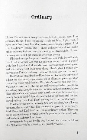 August Pullman was born with a facial difference that, up until now, has prevented him from going to a mainstream school. Starting 5th grade at Beecher Prep, he wants nothing more than to be treated as an ordinary kid—but his new classmates can’t get past Auggie’s extraordinary face. Wonder, begins from Auggie’s point of view, but soon switches to include his classmates, his sister, her boyfriend, and others.