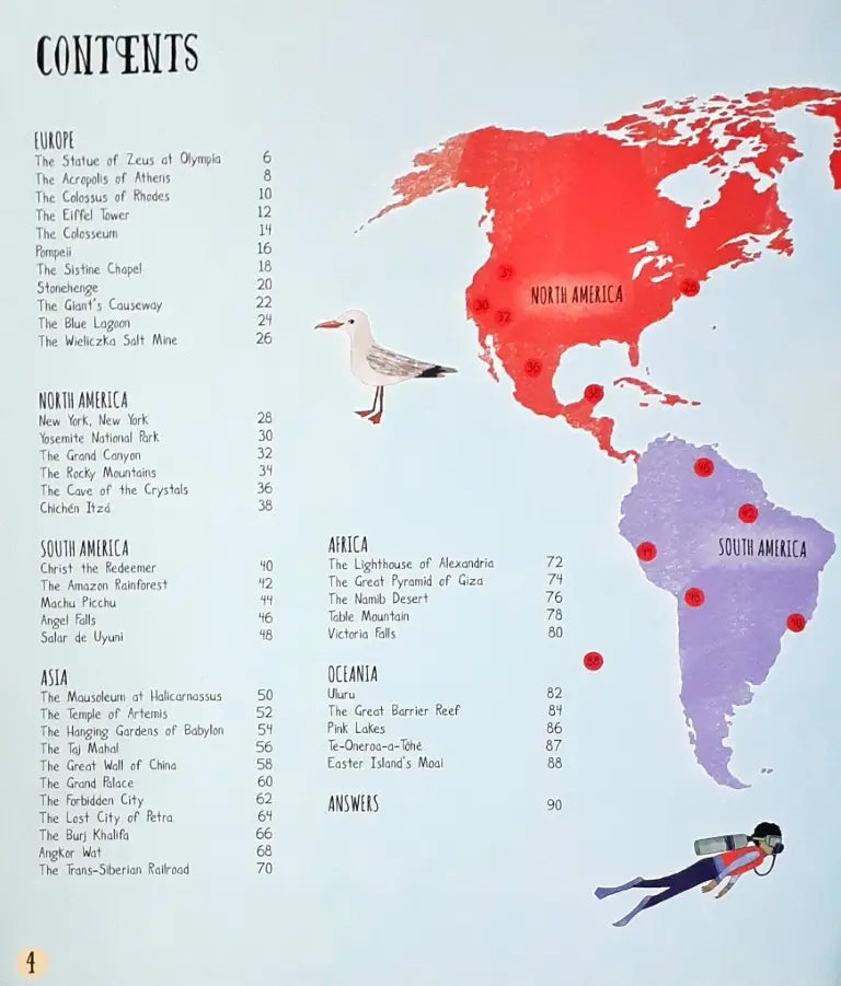 Embark on an extraordinary journey around the world and discover its most awe-inspiring sights with this one-of-a-kind activity book. Take a whirlwind tour of the seven wonders of the Ancient World, from the Great Pyramid to the Hanging Gardens of Babylon. Explore natural marvels like the Cave of Crystals in Mexico and the Grand Canyon, and marvel at impressive human-made structures such as the Taj Mahal and the Great Wall of China.