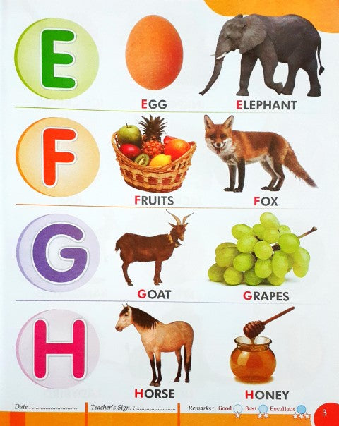 This book provides lot of practice of capital letters/upper case alphabet tracing & independent writing. Multiple exercises and activity pages are also there to apply the learnings and help the child to come up the learning curve.