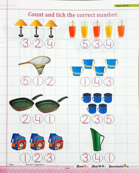 This book provides enough practice for tracing numbers 1 to 50 and also for writing these independently. It also has multiple exercises/activities to keep the kids engaged and to apply the skills learnt