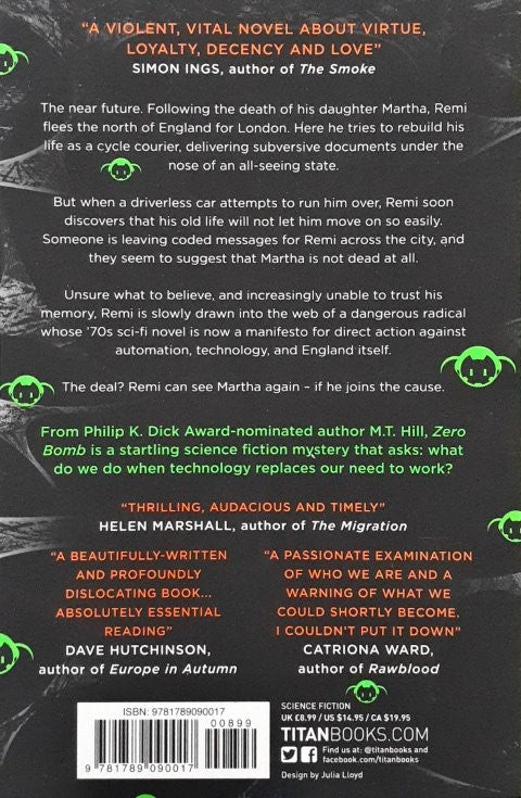In M.T. Hill's The Zero Bomb, the near future sees Remi fleeing the north of England for London after the death of his daughter, Martha. Attempting to rebuild his life as a cycle courier, Remi begins delivering subversive documents in a state that is all-seeing. However, his new life is upended when a driverless car tries to kill him. Soon, Remi finds himself receiving coded messages across the city suggesting that his daughter may still be alive.
